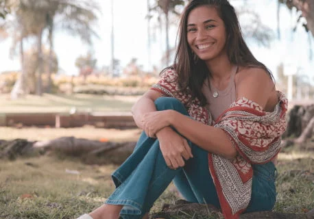 Assise sur le rebord d’un béton ceinturant le corps d’un arbre, Femmes de Polynésie rencontre Camelita Mokhtari à l’orée d’un jardin côtoyant la route de...