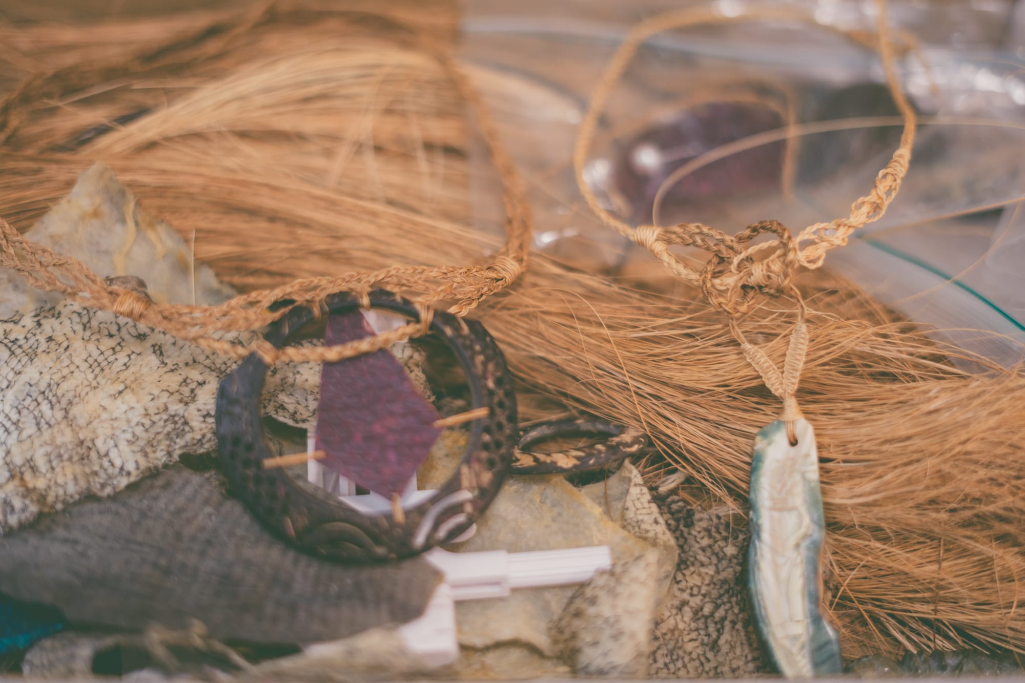 Lorsque notre regard effleure les alentours, il se heurte à des vases, des pierres, des bijoux, des étoffes, du cuir de poisson, des toiles… Haamouraa semble vivre pour créer, et apprendre à créer.