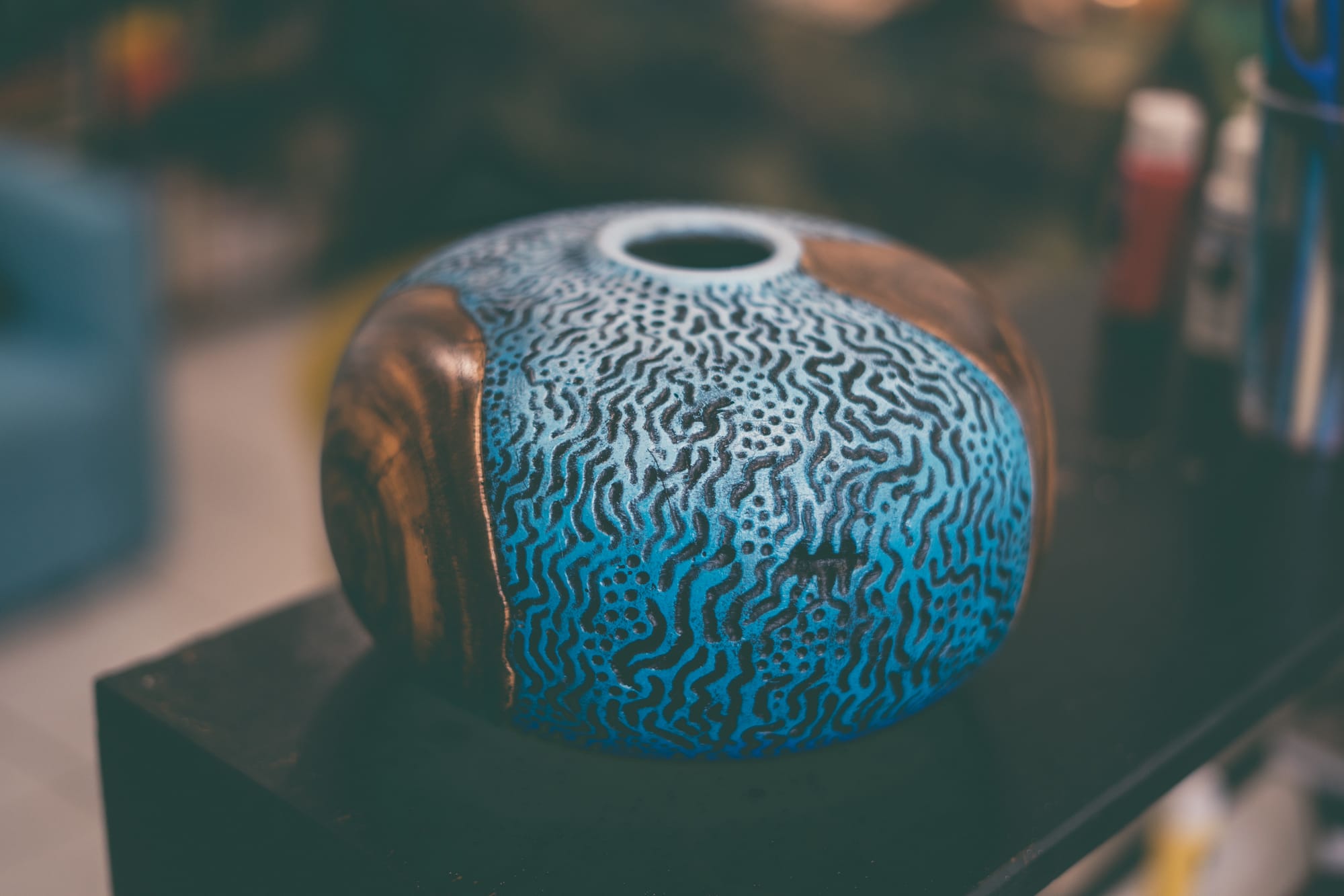 « Pour la fibre de coco, j’ai appris à tresser avec Florine de Firinape Créations qui fait des choses magnifiques. Phil Christo m’a appris à tourner et sculpter alors que je ne savais vraiment rien faire de ça. »