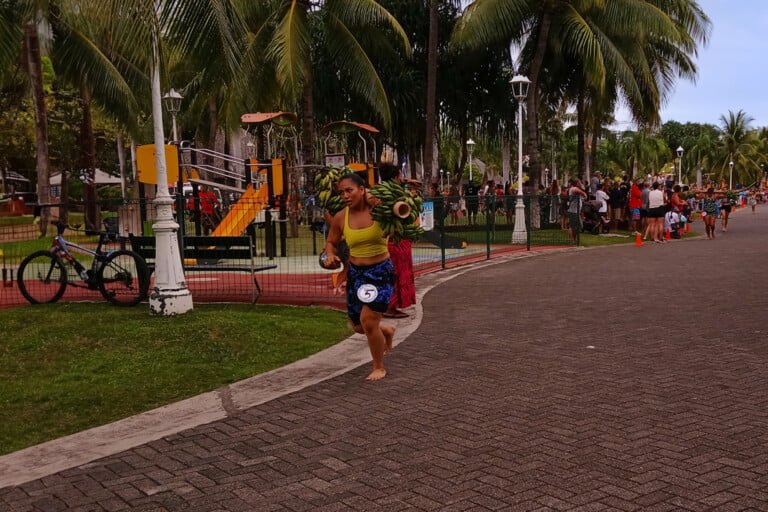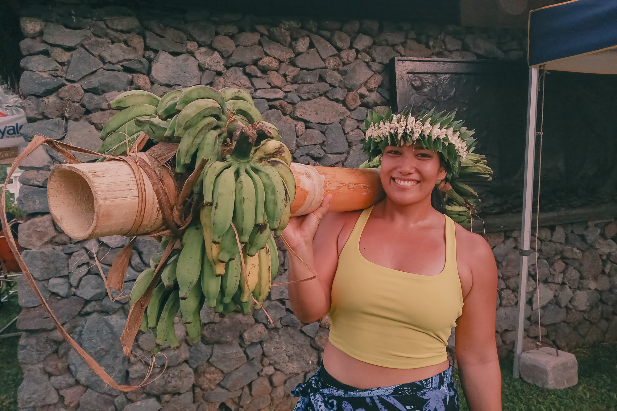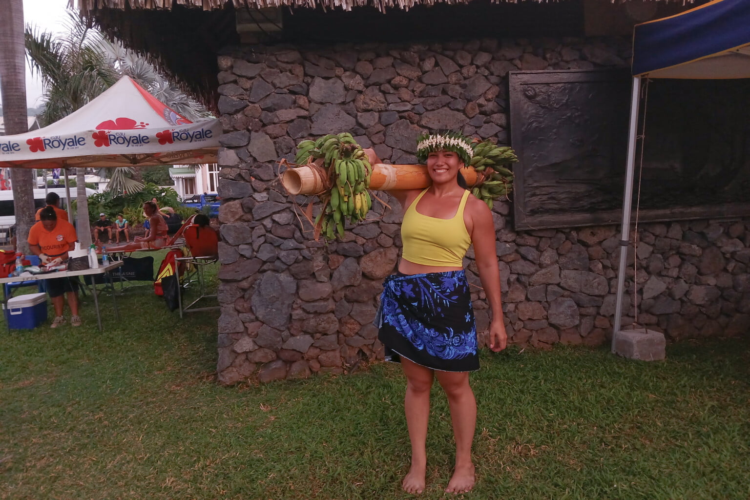 Jade s’est prêtée à la tradition en remplaçant son short, ses haltères et ses baskets par un pāreu et des bananes pour courir, pieds nus, lors de la course des porteuses de fruits.