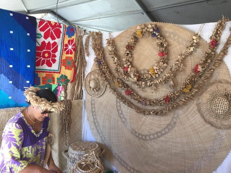 Les deux femmes ont la passion communicative, cela se sent à la lueur qui scintille dans leurs yeux lorsqu’elles vous expliquent les techniques traditionnelles des Australes. Elles maîtrisent à la perfection le tissage de pandanus, de ni’au (feuille de cocotier) ou de fe’i (feuille de bananier).