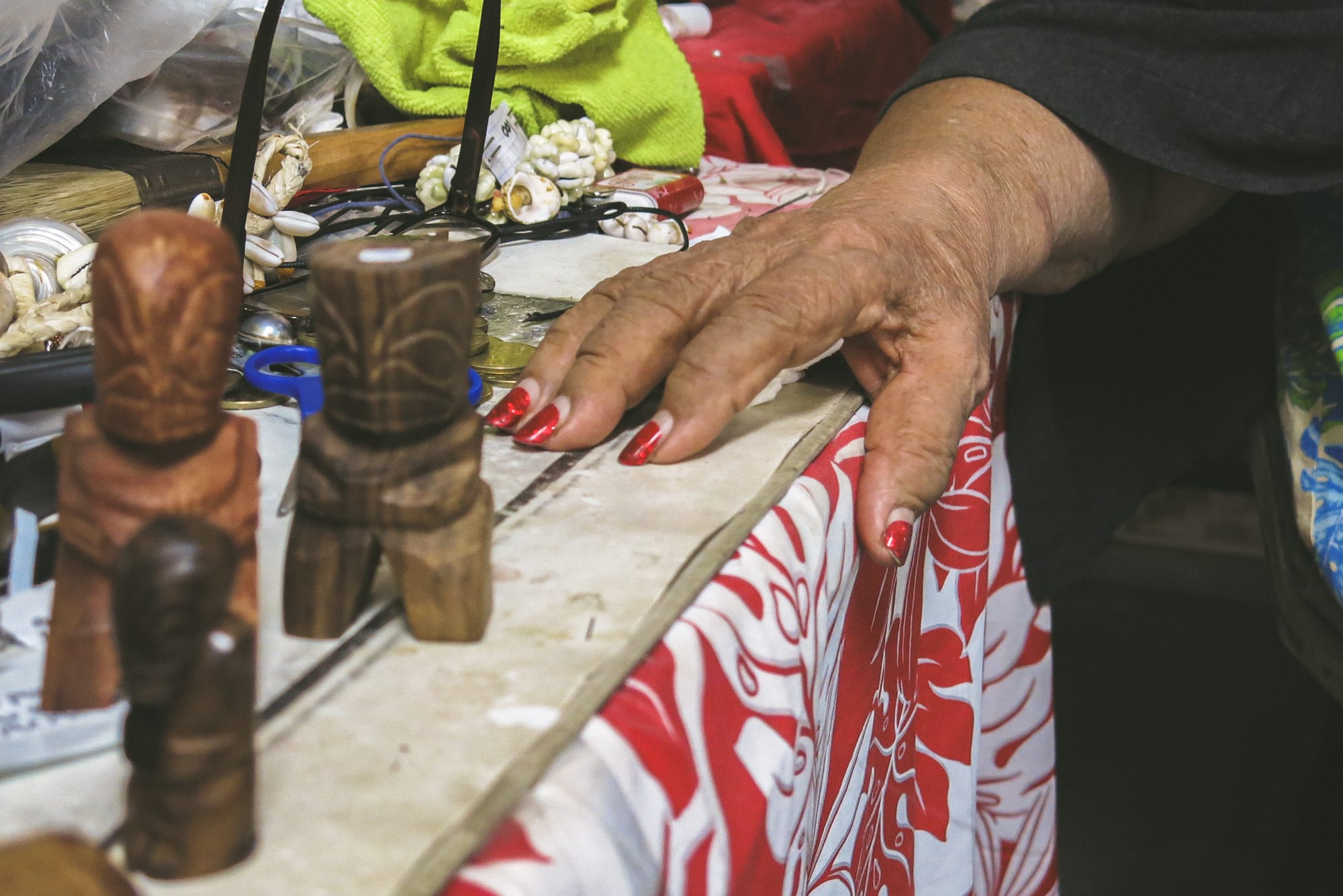 À l’entrée du shop, une grande table recouverte d’une nappe à fleur est parsemée de projets en cours, de pièces à réparer. C’est ici-même que la magie opère. Figure emblématique du marché de Papeete, Mama Fauura accueille ses clients d’un large sourire.