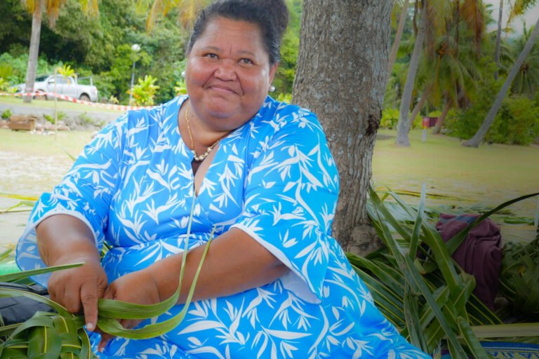 À l’occasion d’une Journée polynésienne¹ sur le site du marae Taputapuātea, à Raiatea, Femmes de Polynésie remarque Yelhée, une femme simple et majestueuse qui fait corps avec le décor. Endimanchée dans une robe bleue fleurie, parée de perles, elle fait danser entre ses doigts les palmes de cocotier. Fascinés par ce tableau harmonieux qu’elle offre à notre vue, nous avons voulu connaître son histoire.
