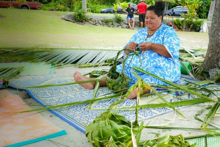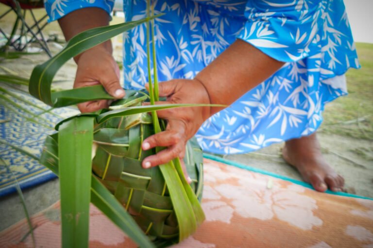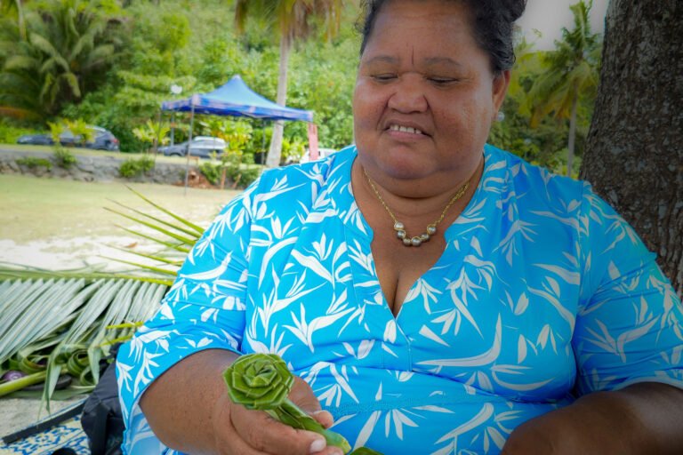 Tout en saisissant le panier d’une dame pour l’aider à s’y retrouver dans les feuilles à positionner dessus, dessous, dessus…, Yelhée raconte son coup de cœur avec le nī’au, la palme de cocotier, et le pae’ore, la feuille de pandanus.