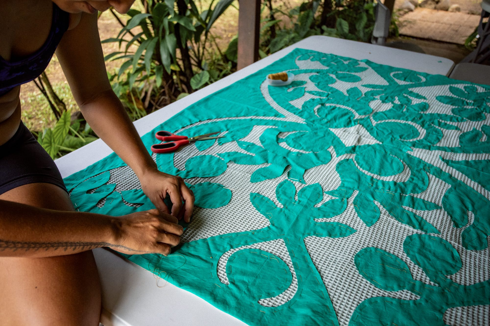 C’est comme ça qu’en rentrant à Moorea, je me suis tournée vers le tīfaifai. Ici, ça se transmet de mère en fille. Maman n’en cousait pas, mamie non plus. Il y a un lien à entretenir avec les anciens à travers cet art. Les motifs sont passés de génération en génération. Des arrière-grands-mères les ont laissés à leurs enfants. Peut-être qu’eux-mêmes ne font pas de tīfaifai, mais ils ont toujours le patron dans leur placard. »