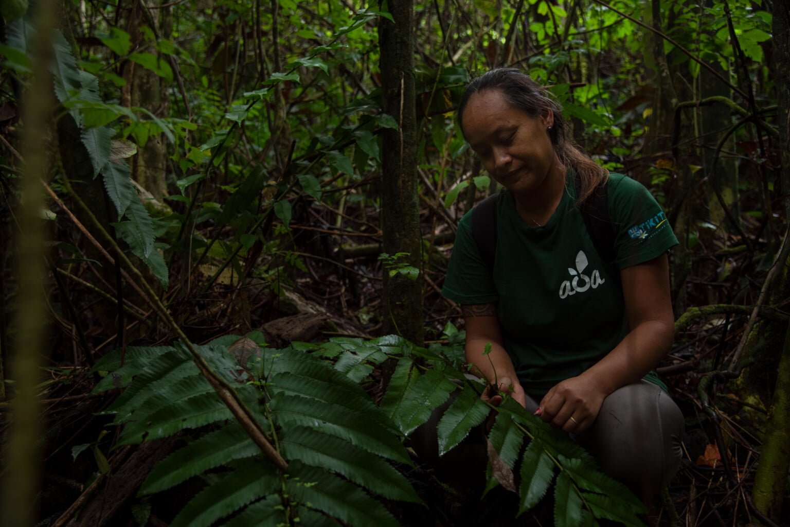 C’est dans la vallée de Mo’aroa à Mataiea que Femmes de Polynésie retrouve, sous la pluie, Lyncia Bernardino et son équipe entre les lianes, les fougères et les arbustes. Elle donne au groupe les dernières instructions avant de nous accorder un moment sous la bâche de la « cantine ». Avec Aoa, la première initiative polynésienne vouée à restaurer la biodiversité et l’état écologique des forêts locales, Lyncia s’engage sur le terrain en tant que chef d’équipe des agents forestiers.