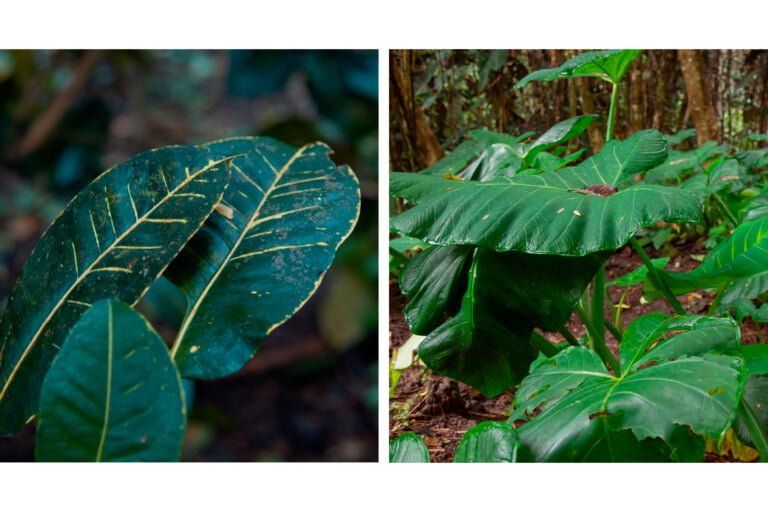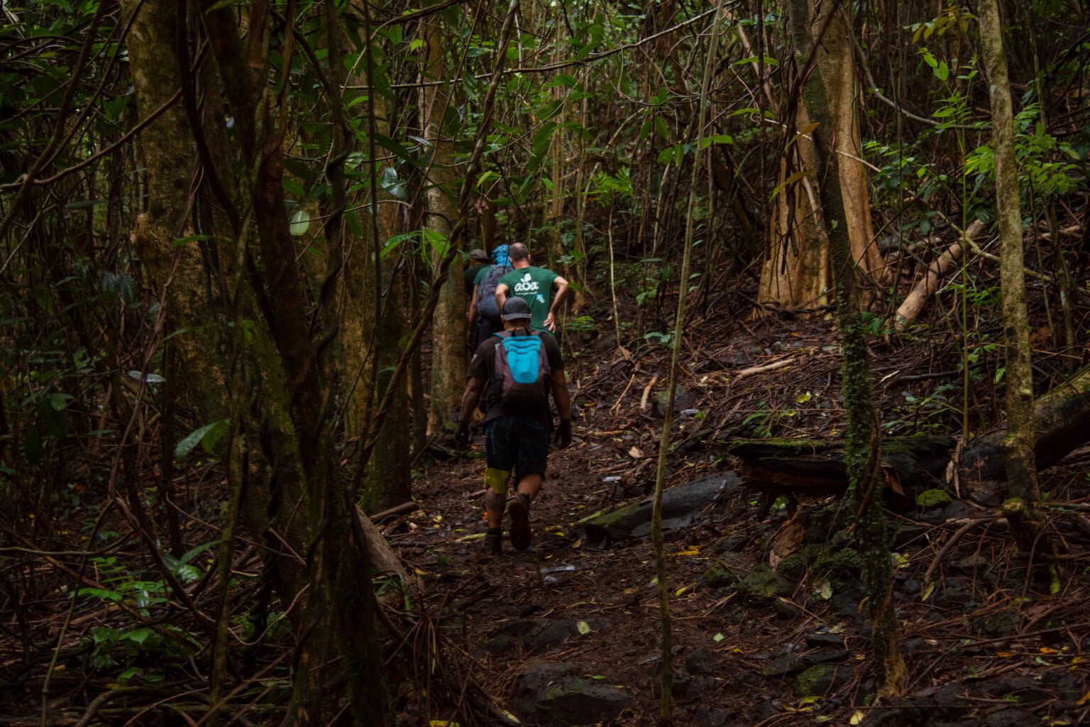« La deuxième phase consiste à recenser les plantules qui ont poussé. Surveiller ce qui est utile puis planter ce qui est désirable. On va remettre des Mara3, des Purau4, des Apape5… On ne va pas essayer d’éradiquer les espèces invasives, on va plutôt essayer de neutraliser leurs impacts négatifs. Le fait que les pisse-pisses (tulipier du Gabon) n’aient plus de lumière pour germer, petit à petit, ils vont arrêter de coloniser cet endroit. Si tu vois autant de tulipiers du Gabon, c’est parce que cette zone a été défrichée à un moment, probablement pour l’agriculture. »