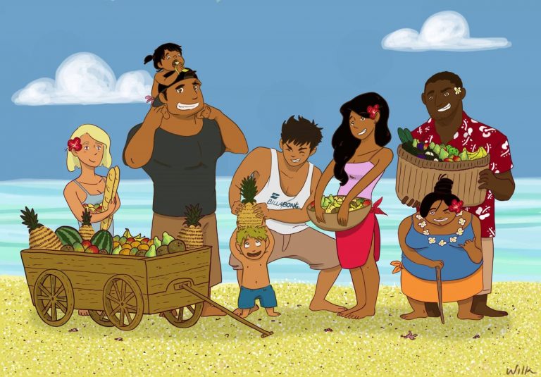 En surfant sur la toile je tombe sur ce dessin. Des personnages qui expriment cette joie de vivre propre à la Polynésie. Mais qui donc a dessiné ça ? En deux clics je trouve le nom de l’auteur…WILK de son nom de scène. J’adresse un message pour faire les présentations et c’est le début d’une belle histoire.