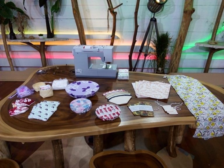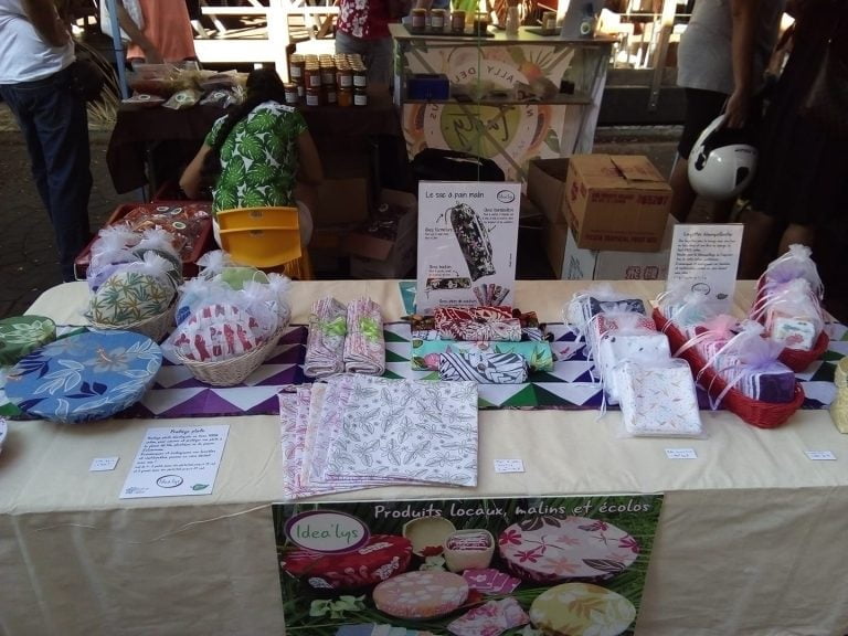 Alice élabore un protège plat en tissus, lavable, réutilisable, destiné à remplacer les films plastiques ou le papier d’aluminium. Pratique et joli, avec des tissus locaux. Et lors du premier ramassage de déchets organisé par l’incontournable collectif NANA SAC PLASTIQUE, des ateliers sont proposés pour sensibiliser la population à toutes ces questions environnementales.