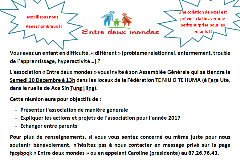 Aujourd’hui, avec l’aide de Caroline et de l’association Entre deux mondes, on parle un peu plus des enfants présentant des troubles envahissants du développement : cela ne peut augurer que de bonnes choses pour l’avenir des enfants de Polynésie qui sont en souffrance. Des moyens sont déjà mis en place à l’école pour accompagner la scolarisation de ces enfants. Disponible et engagée, Caroline reste à l’écoute des parents d’enfants ayant des troubles du développement. N’hésitez surtout pas à vous renseigner auprès d’elle pour plus d’informations et de conseils afin que nos enfants présentant des troubles du développement en Polynésie ne soient pas laissés de côté.