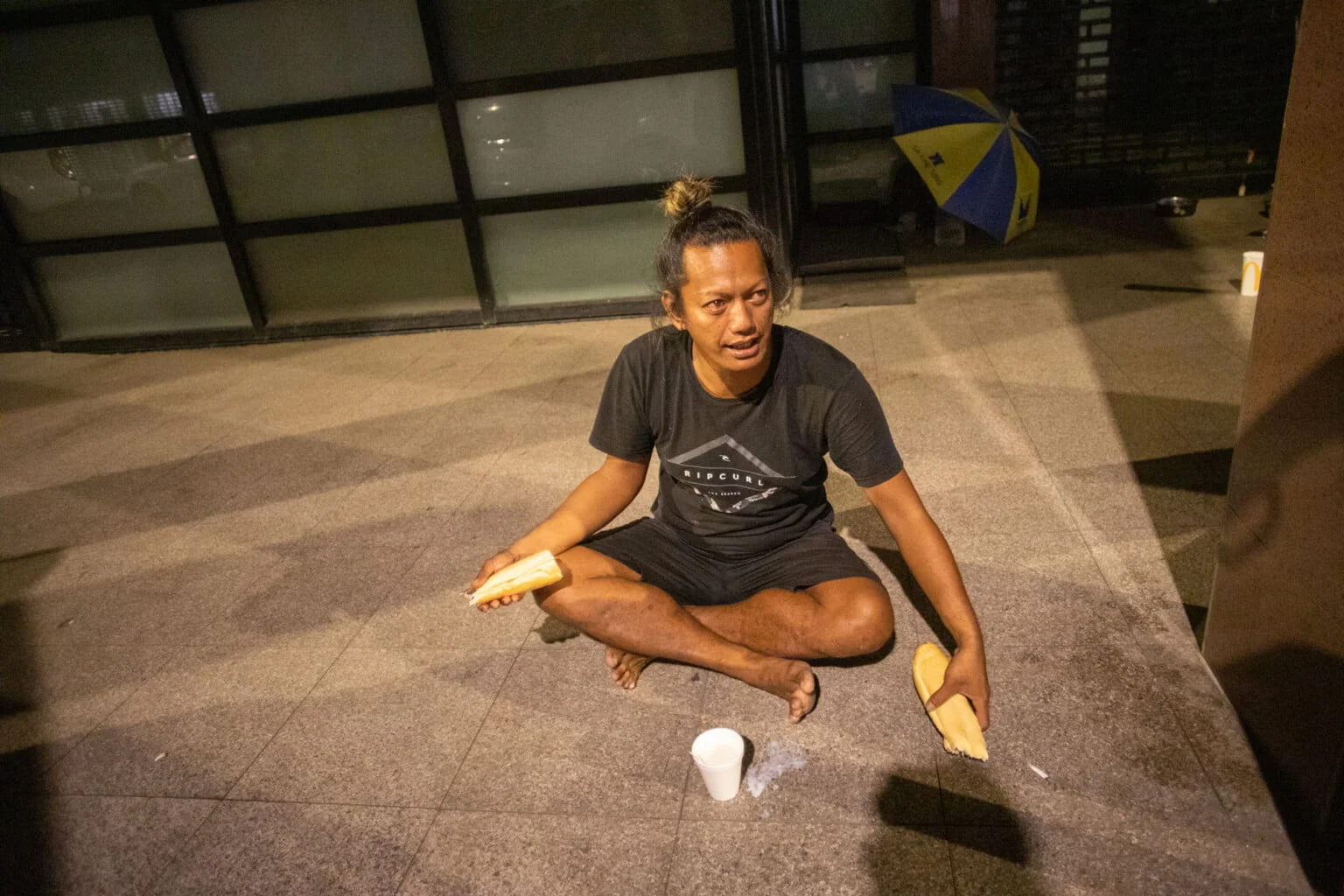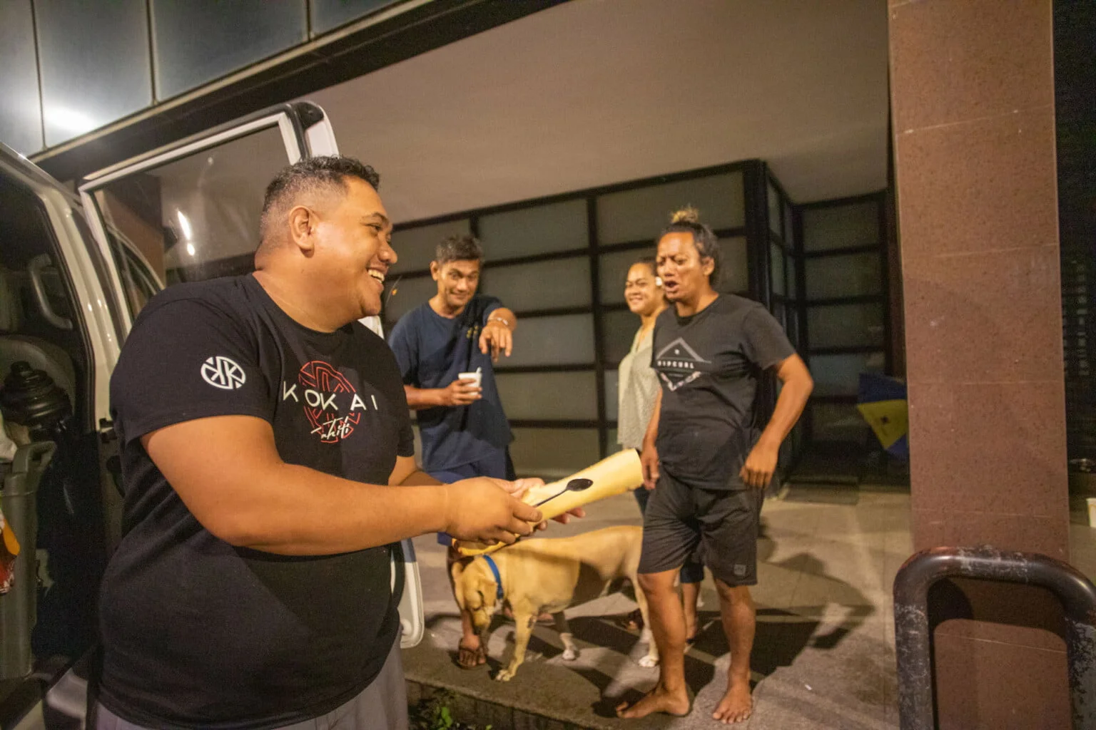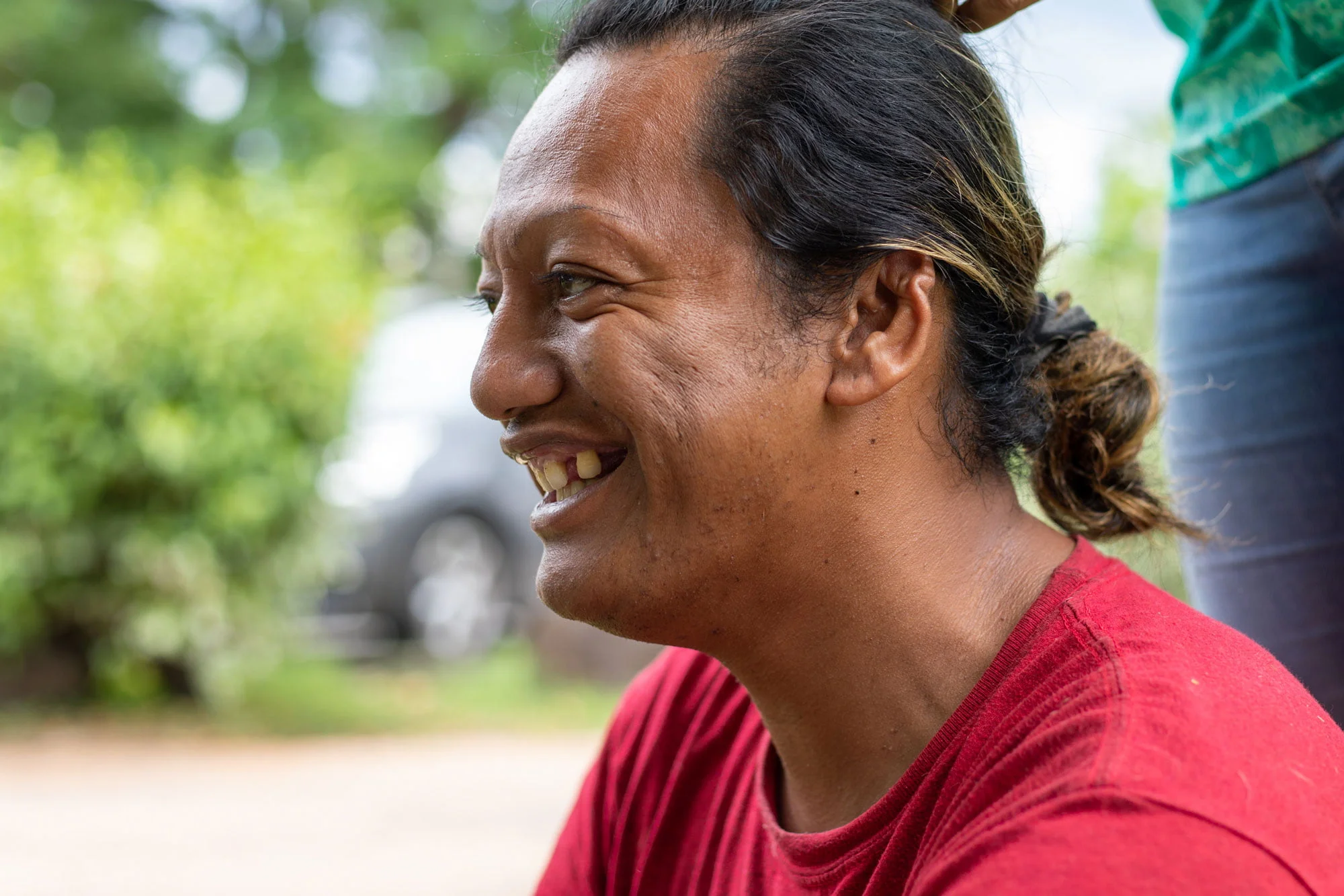 Son ami a débuté cette année un contrat de travail à l’OPT, grâce au programme de réinsertion professionnelle Nati o Te Torea, en partenariat avec plusieurs entreprises du pays. De belle prestance, Abel est rasé de près, sa coiffure et ses vêtements sont impeccables : il ne correspond pas vraiment à l’image que l’on se forge d’une personne sans-abri. Il se penche vers Romana dans un geste d’affection, puis se met à l’aise après sa journée de travail ; il se déchausse, comme s’il rentrait à la maison.