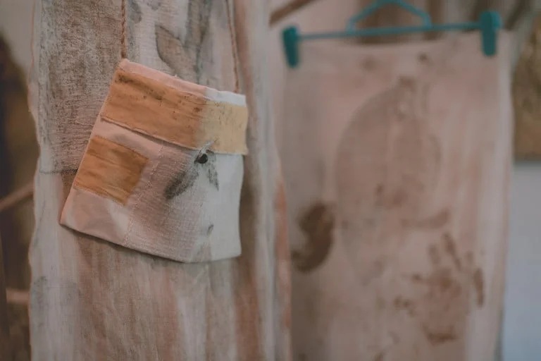 « Je vais dans la nature ramasser du bois, des feuilles, des écorces. Puis je prépare mes pigments et mes tissus. Quand la base est préparée, c’est l’étape de l’impression botanique, c’est-à-dire l’impression du pigment de la feuille directement sur le tissu, de manière ancestrale. »