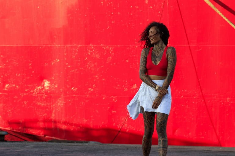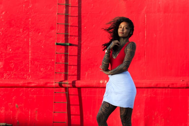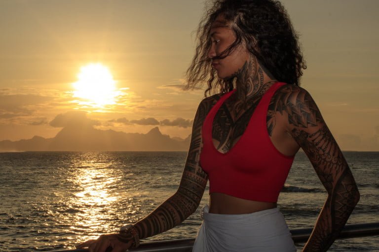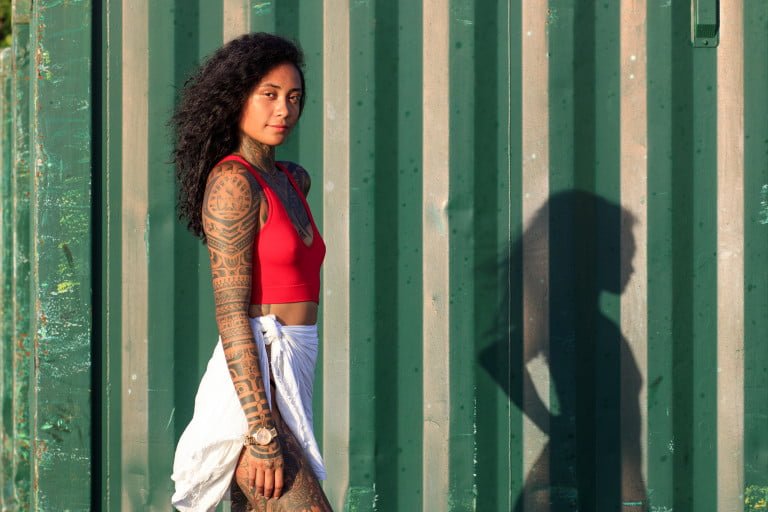 Le vent souffle fort sur l’île de Motu Uta, il balaie les quais, s’infiltre entre les conteneurs et les bateaux de commerce. Ses rafales font voler la chevelure ondulée de Shanna Hitimaue, dispersent ses paroles et ses mots qui révèlent une vie tourmentée. Devant la coque rougeoyante du Taporo VI, sa silhouette se démarque, peinte d’une lumière chaude et vespérale, et presque entièrement recouverte de tatouages. Sur cette île portuaire collée à la ville, mais déjà proche de l’océan, Femmes de Polynésie découvre la première dauphine Miss Tatau 2019. Rencontre avec une fleur.