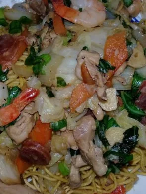 4 Plat chinois tropicalisé composé de porc, haricots rouges, pâtes, chou chinois.