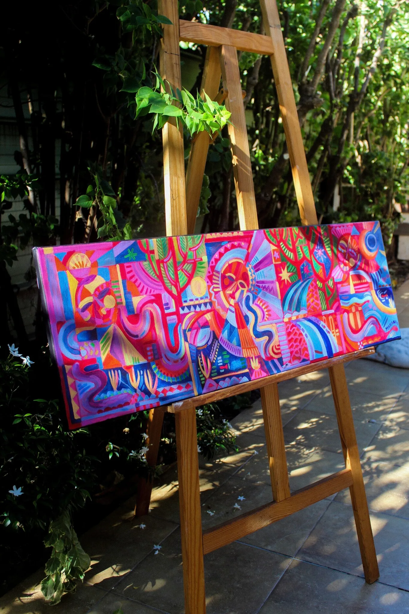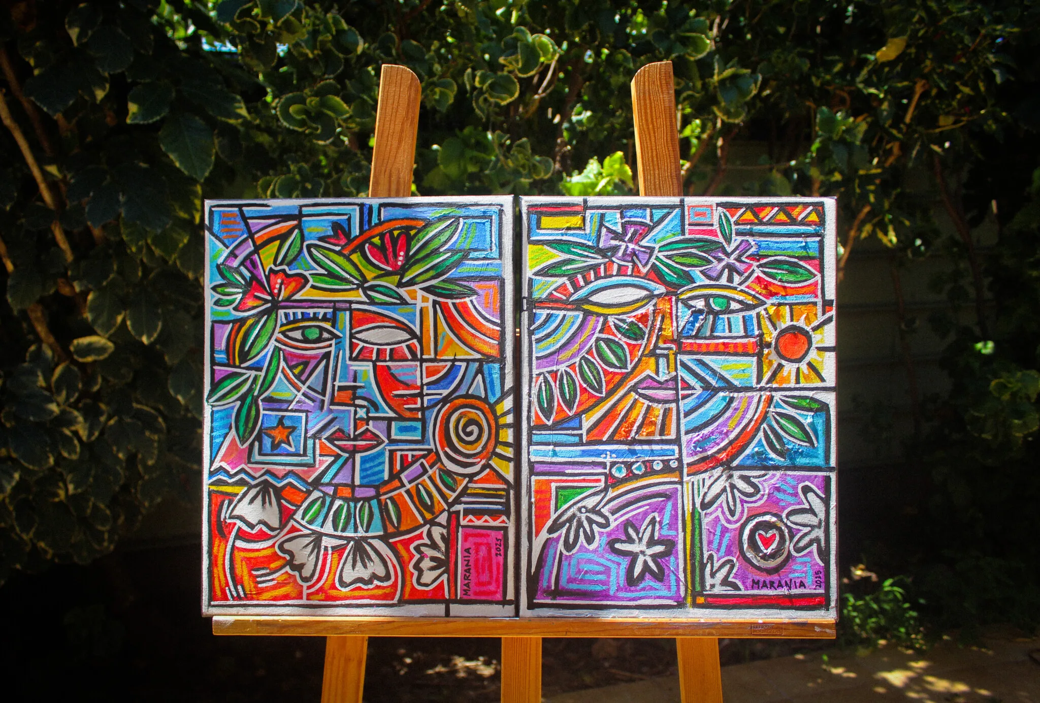 Avec ses pinceaux, ses rouleaux, sa peinture et ses pastels, Marania conçoit dorénavant des mondes dont les couleurs vibrantes tissent des liens avec l’imaginaire.