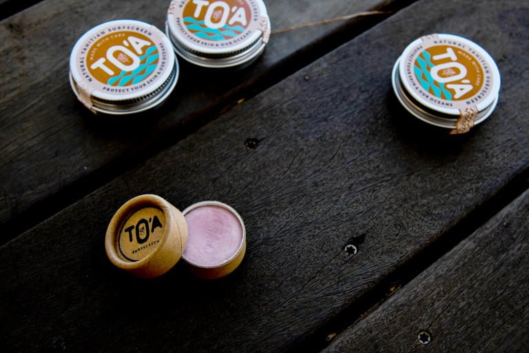 Deux ans, 27 formulations, un nom et un packaging (dessiné par une amie) plus tard, To’a (du tahitien “corail”) voit enfin le jour. Exit plastique, kraft et verre, bonjour aluminium alimentaire ! Un pot rechargeable à souhait, dont le contenu se résume à de l’huile de coco vierge pressée à froid par Isabelle et Johnny, des artisans de Teahupoo, du beurre de Karité, de l’huile de jojoba peu-comédogène2, de la cire de riz et de l’oxyde de zinc sans nanoparticule, qui donne ce film blanc. Un produit naturel et biologique qui bloque jusqu’à 98% des UVB3, avec un FPS4 30.