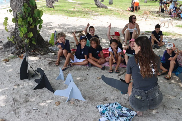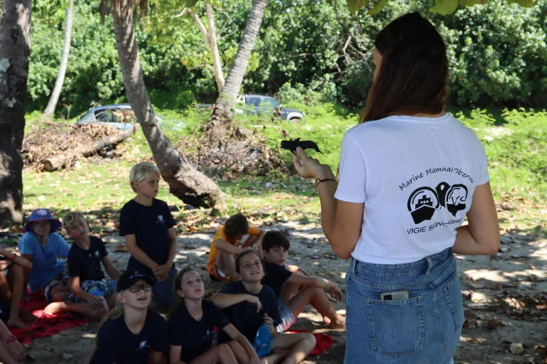 « On fait beaucoup d’interventions dans les écoles, les collèges et les lycées pour parler des cétacés mais aussi des principales menaces comme les collisions avec les navires, la pollution sonore, la pollution plastique, … On intervient également de temps en temps à l’Université de la Polynésie française ainsi qu’à la station de recherche Gump de Moorea ou encore au CRIOBE. On vise surtout un public jeune car ce sont eux les futurs acteurs de notre planète, mais aussi parce que les enfants peuvent sensibiliser leurs parents à leur tour. »