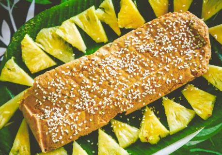 Voici une version joliment présentée d’un pâté végétarien signé Victorine Tihopu, de la pension de famille The Niu Shack, à Raiatea. L’astuce, choisissez un plat adapté à la quantité pour que le pâté soit bien moulé. La réfrigération permet aussi de lui donner une belle tenue.