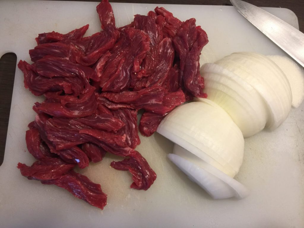 - Découper la bavette en lamelle et l’oignon en demi rondelles grossières (cf. photos).
