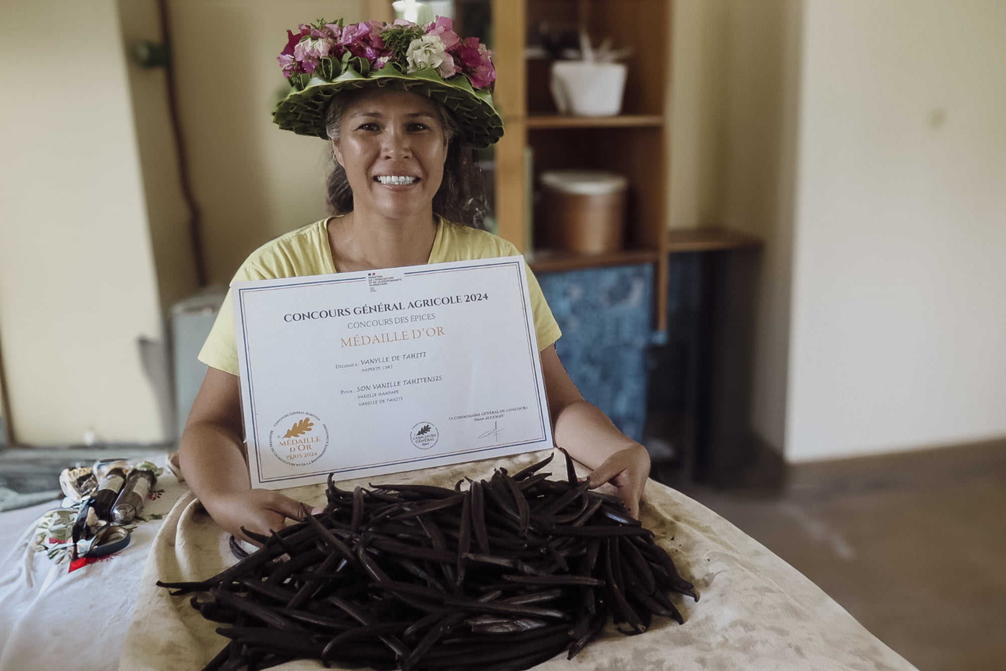 Ses gousses ont été jugées sur leur aspect visuel et gustatif : elles sont brunes, grasses, souples, avec des arômes ronds de pruneau. Ses variétés Tahiti et Haapape enchantent les papilles. La médaille d’or semble saluer les efforts de cette femme de vanille :
