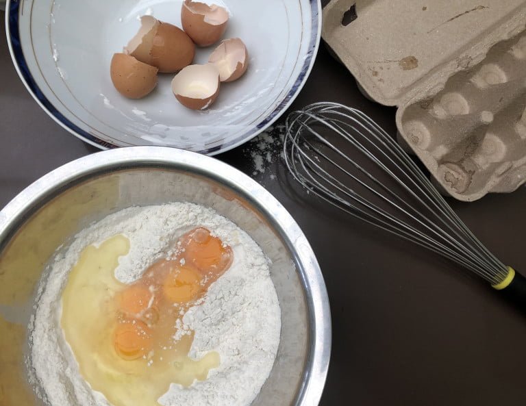 Il suffit de mélanger les farines, y creuser un puit pour y casser les oeufs.