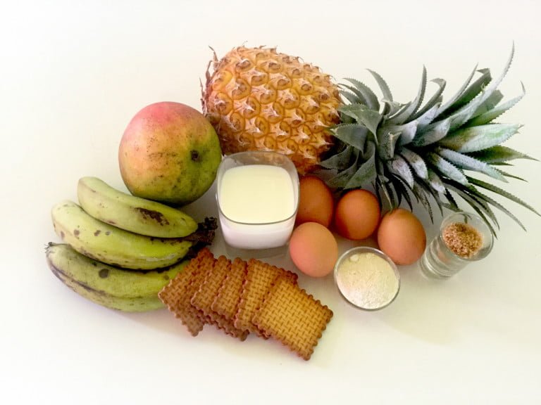 3. Placez les dés d’ananas au fond d’un plat passant au four, ensuite 9 biscuits, la crème pâtissière, les dés de mangue, les derniers biscuits, la crème, placez les rondelles de banane et décorez le tout avec les tranches d’ananas et de mangue.