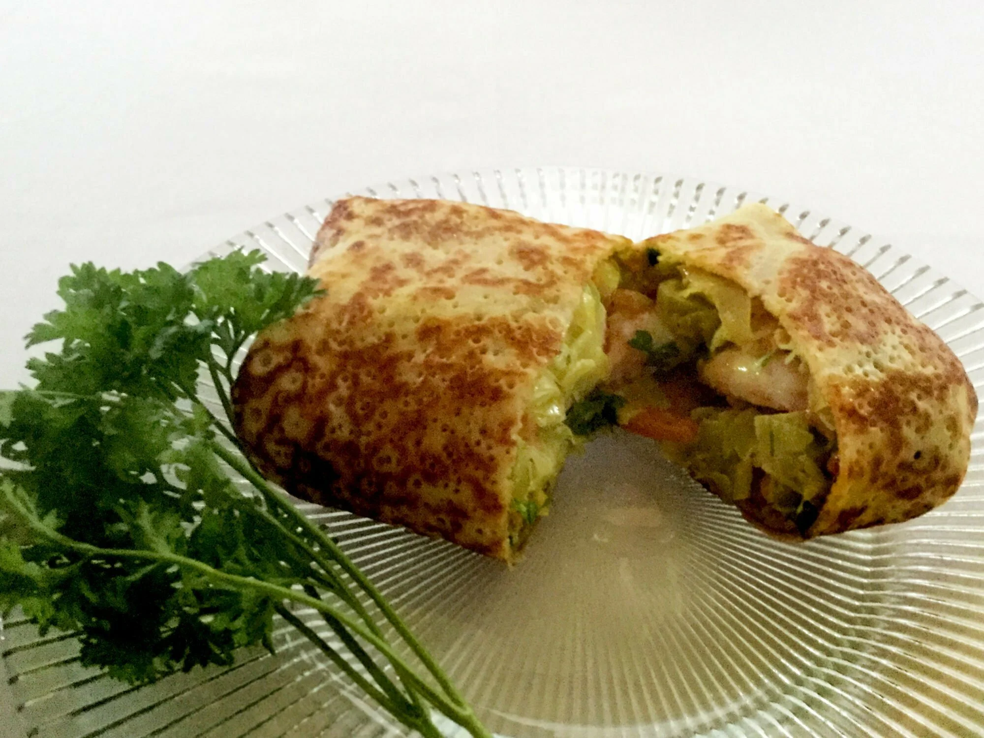 4. Garnissez chaque crêpes de légumes, cinq crevettes, de persil et à nouveau de légumes. Enroulez vos pannequets (comme si vous faisiez des nems), placez-les dans un plat passant au four, mettez le restant de beurre sur le dessus et enfournez 20 minutes à 180°C.