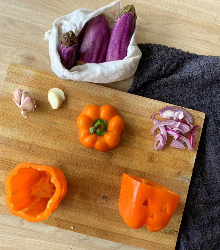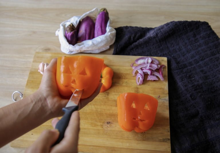 - Pendant ce temps, ouvrir les poivrons et retirer les graines puis découper des triangles pour former des yeux, un nez et une bouche dans chaque poivron. Couper les aubergines en petits dés, puis hacher l’oignon et l’ail.
