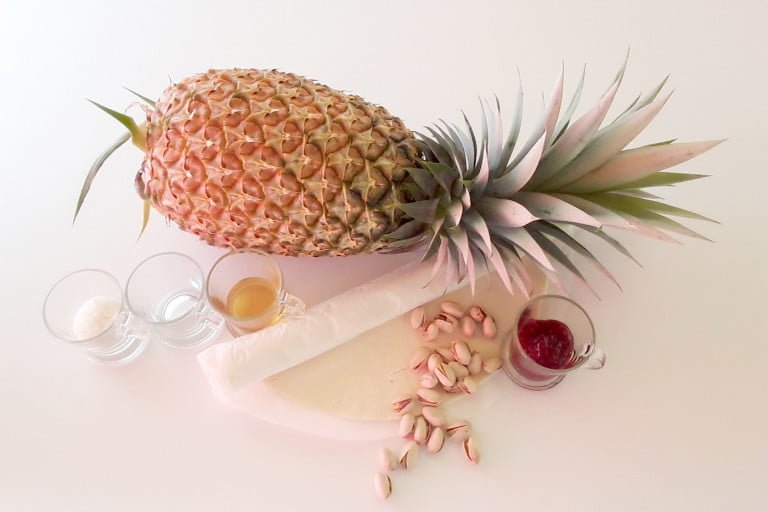 - Écrasez les pistaches et parsemez-les sur l’ananas, saupoudrez de coco râpé et badigeonnez les bords de la pâte de jaune d’œuf.